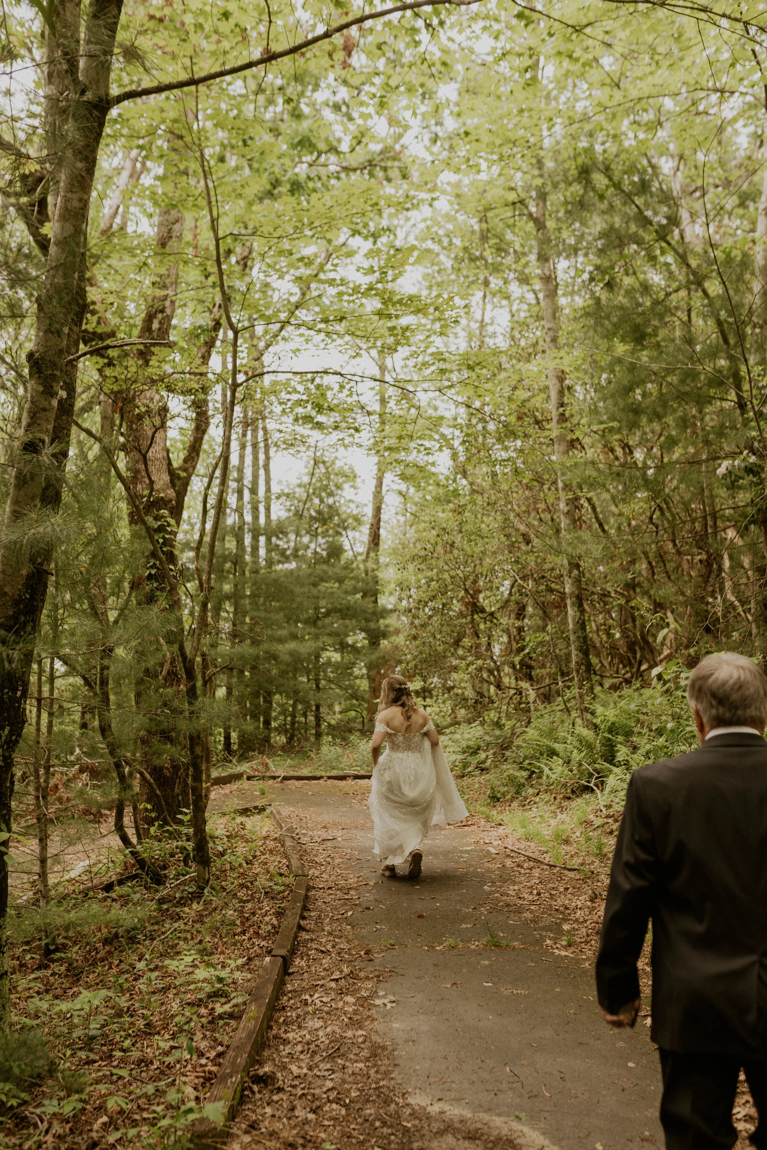Ashley’s dad walked her down the path to meet Joe at their ceremony spot along the gorge rim. The short walk felt symbolic — quiet, steady, intentional.