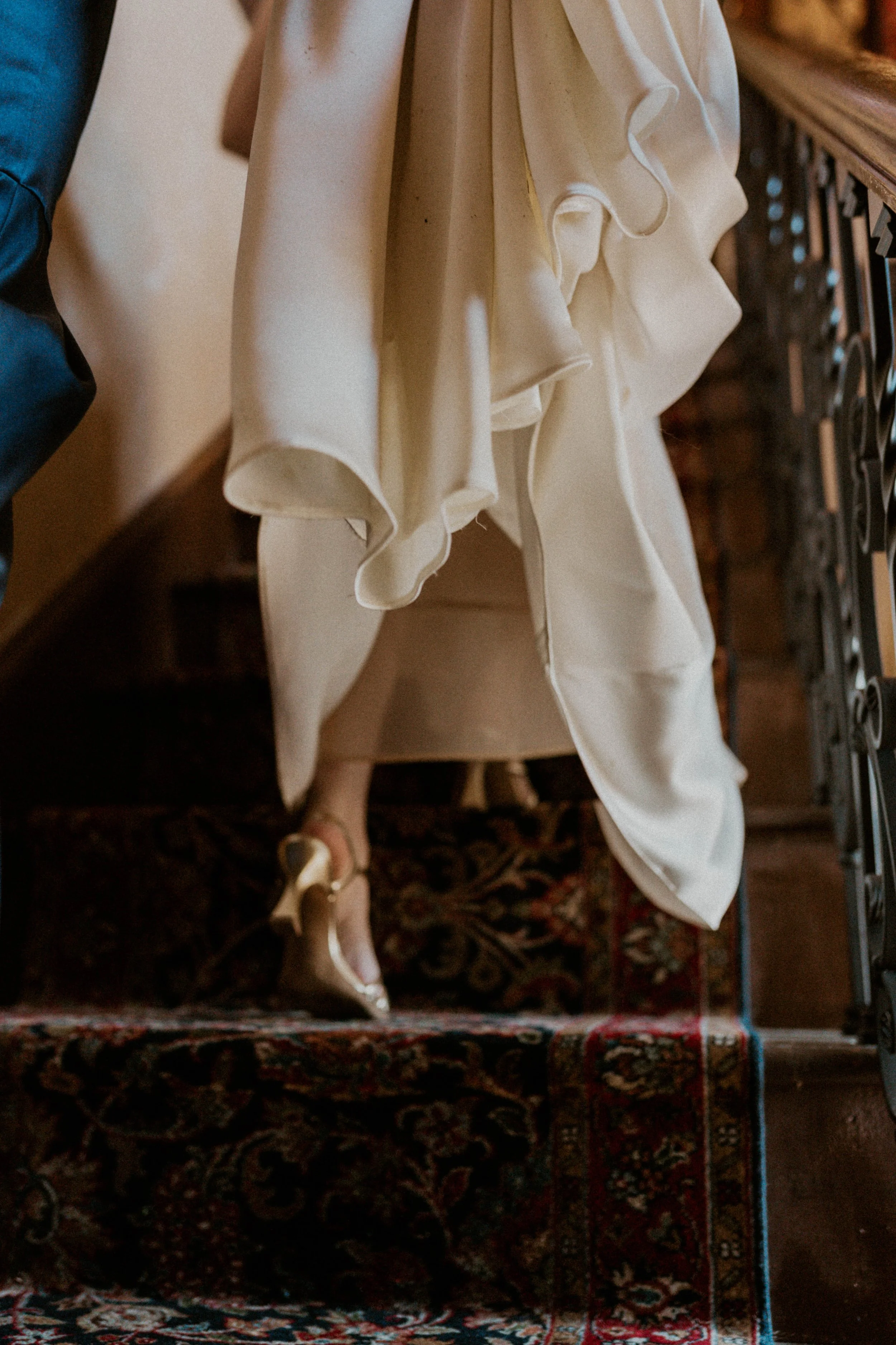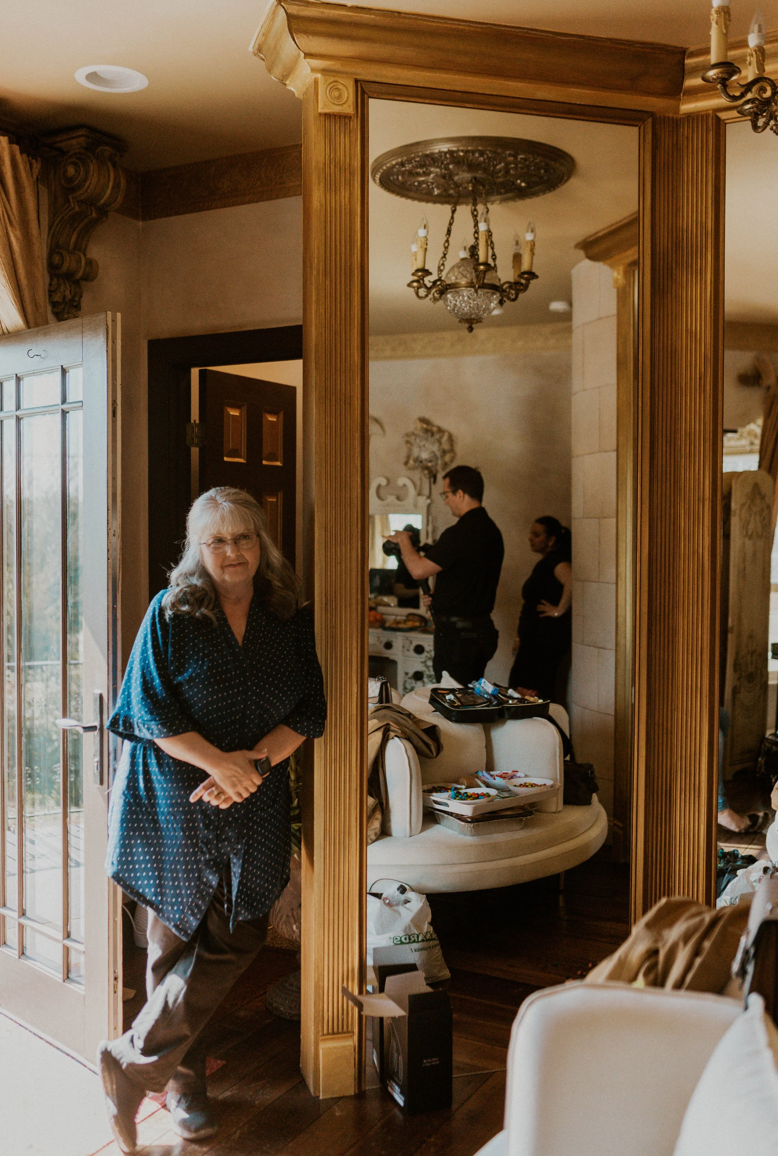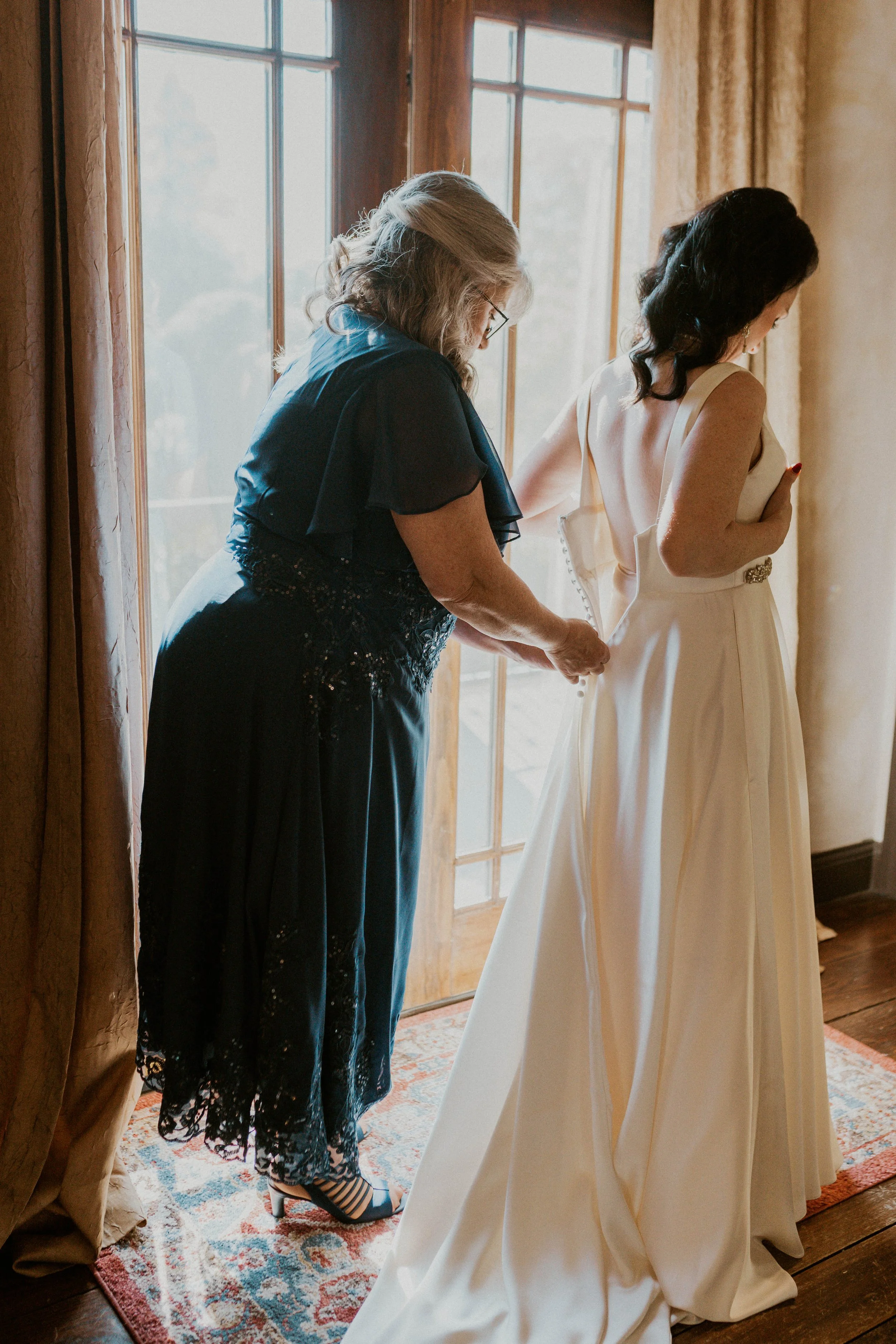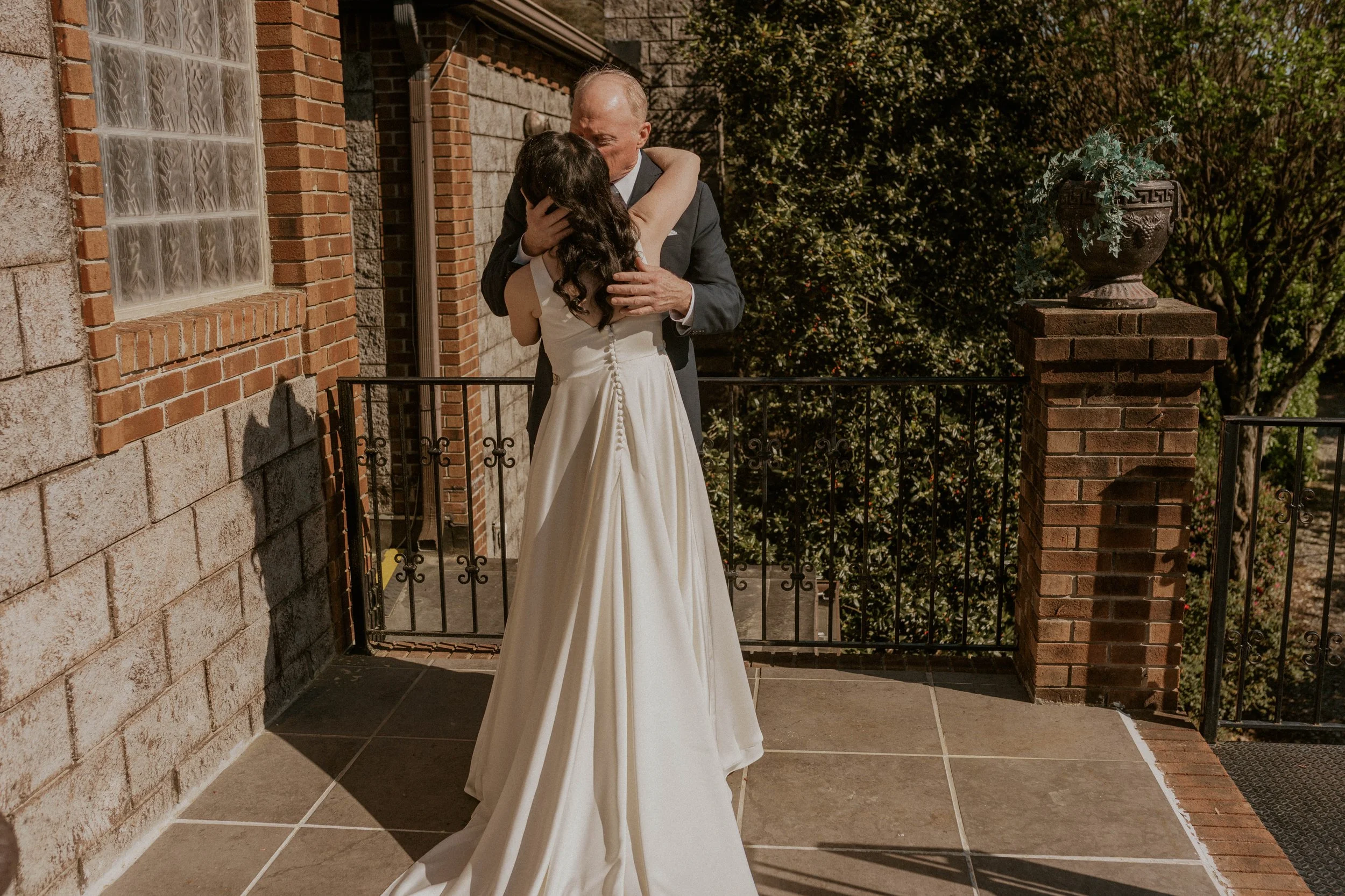 When I showed up to Chateau de Fleures, Kim was relaxed, joking around with her makeup artist, and sipping on champagne. After Kim had her maid-of-honor and mom help her into her dress, she had a touching first look with her dad on the balcony of the suite that she was getting ready in. First looks with parents always make me tear up and this one was no exception.
